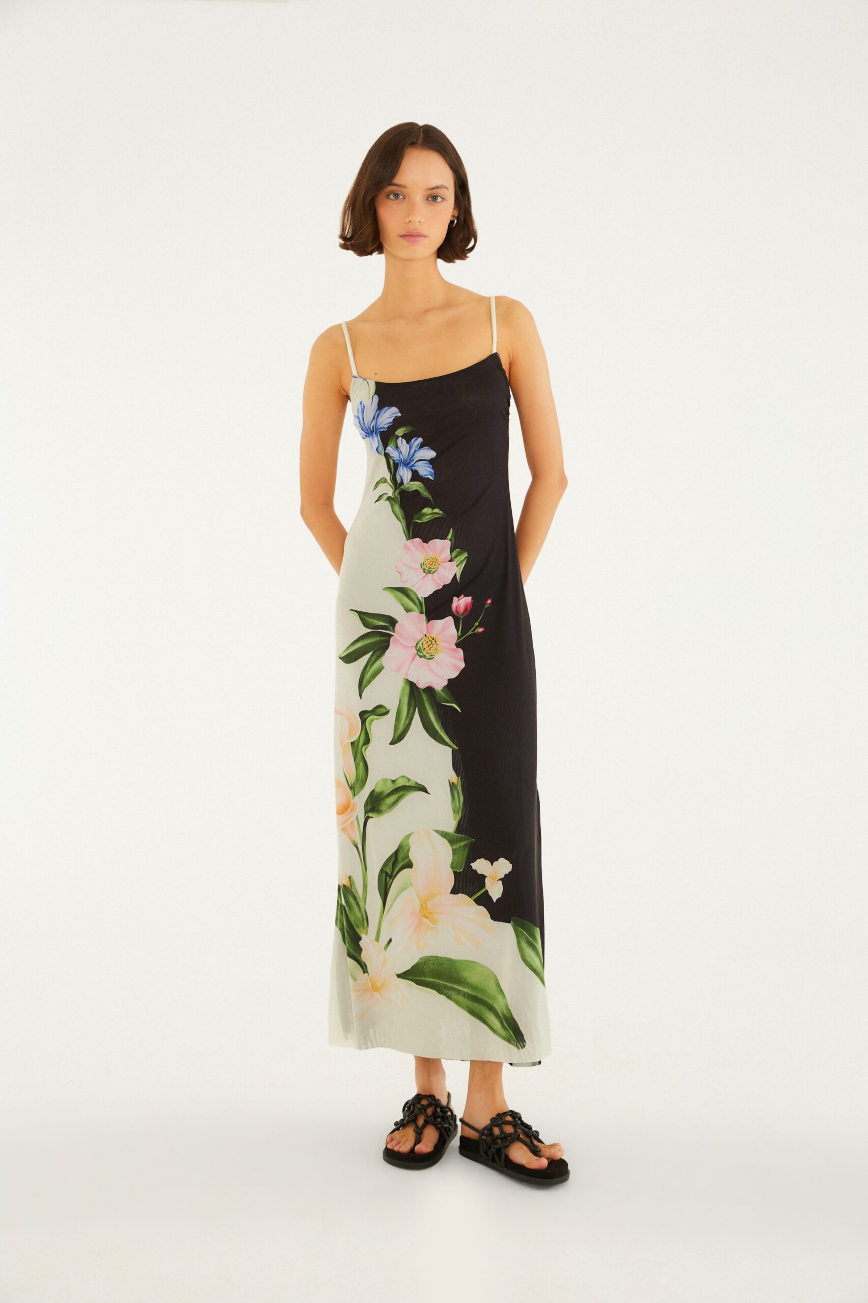vestido tule ombro só céu de flor. delicado e versátil, possui alças finas e decote sutil que evidenciam charme natural. a leveza do tule transforma este vestido em uma peça essencial para ocasiões casuais ou eventos especiais ao ar livre. a modelagem fluida garante conforto e movimento. FARM Rio, coleção Carioca – inverno 26.
